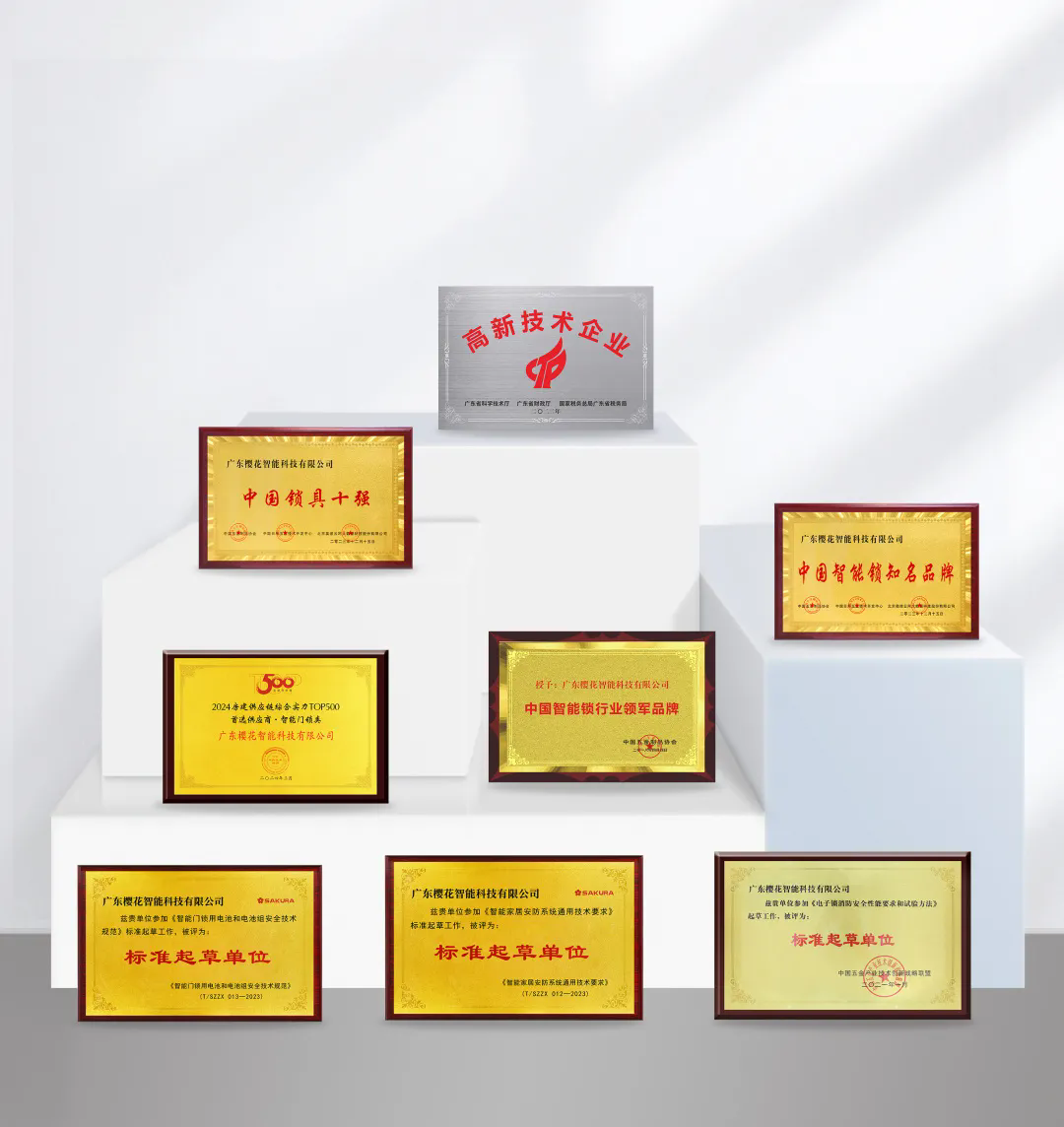 深耕行業(yè)十八載,櫻花智能鎖憑借過硬的產(chǎn)品實(shí)力和生產(chǎn)標(biāo)準(zhǔn)備受行業(yè)各界的認(rèn)可,先后獲得中國智能鎖行業(yè)領(lǐng)軍品牌、廣東省高新技術(shù)企業(yè)、中國鎖具十強(qiáng)、中國智能鎖知名品牌、專精特新企業(yè)、房地產(chǎn)綜合實(shí)力TOP500首選供應(yīng)商等榮譽(yù),成為《電子鎖消防安全性能要求和試驗(yàn)方法》、《智能門鎖用電池和電池組安全技術(shù)規(guī)范》、《智能家居安防系統(tǒng)通用技術(shù)要求》等標(biāo)準(zhǔn)起草單位。以實(shí)際行動(dòng)詮釋了一個(gè)優(yōu)秀企業(yè)的責(zé)任與擔(dān)當(dāng)。